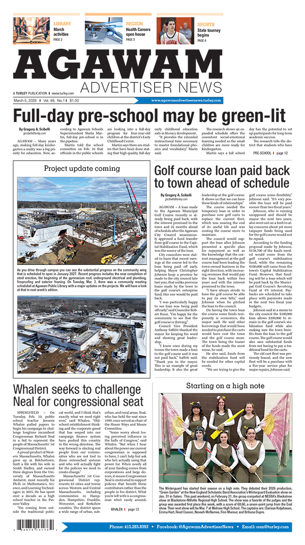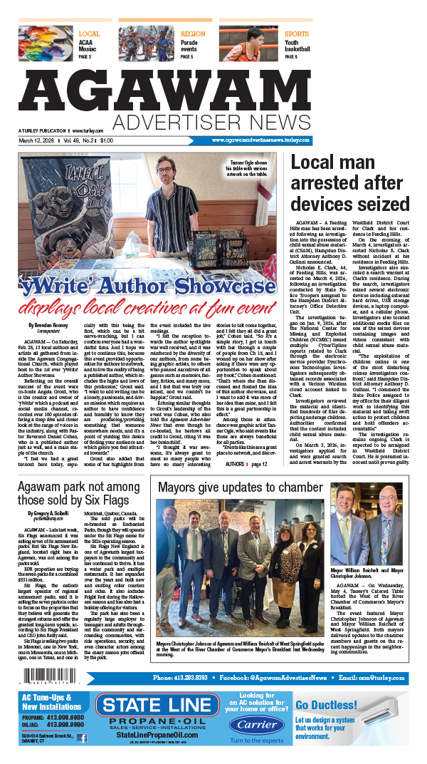 Agawam Advertiser News is a community newspaper serving Agawam and the Feeding Hills Massachusetts area. Agawam Advertiser News is owned by Turley Publications Inc., a local family owned company that has been in business since 1962. We ask for submissions or story ideas and we look forward to informing you about local news and events.